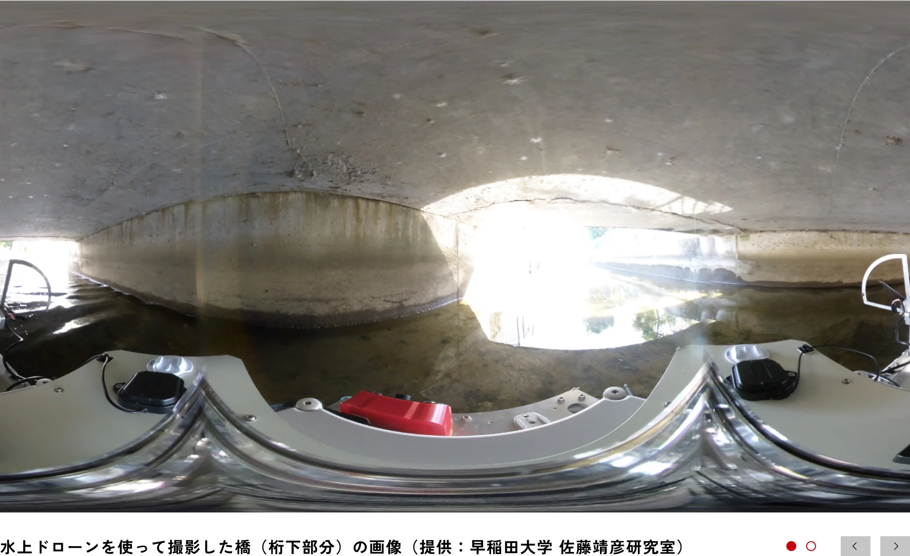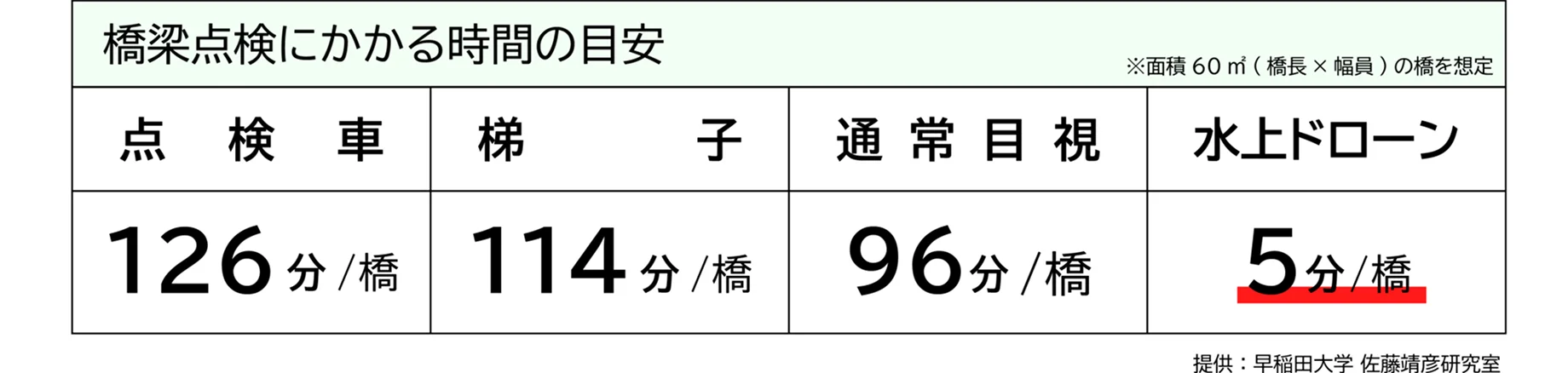 同システムと水上ドローンを使って橋梁点検を行う場合、1橋わずか5分で点検できるとのことです。