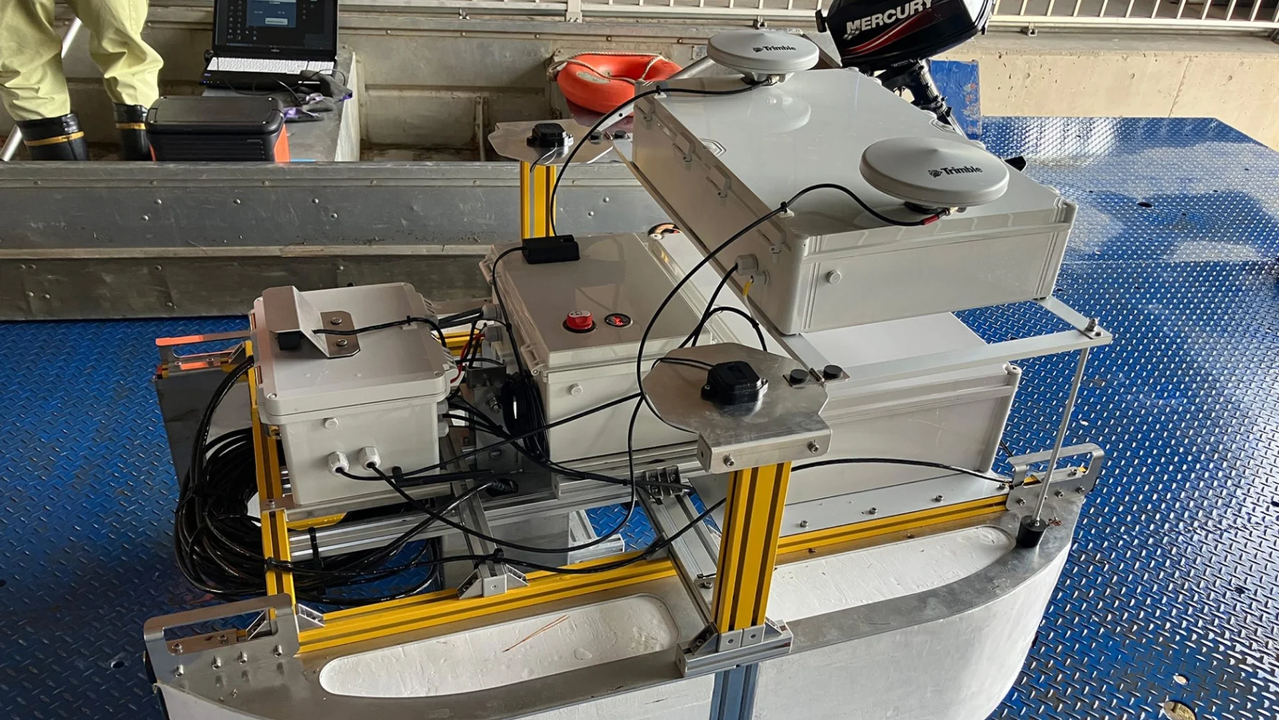 通常、マルチビームやGNSS測量機器を艤装するごとに、オフセット計測やパッチテストを行います。水上測量ドローン導入前は、業務工程の半分以上を準備が占めていました。